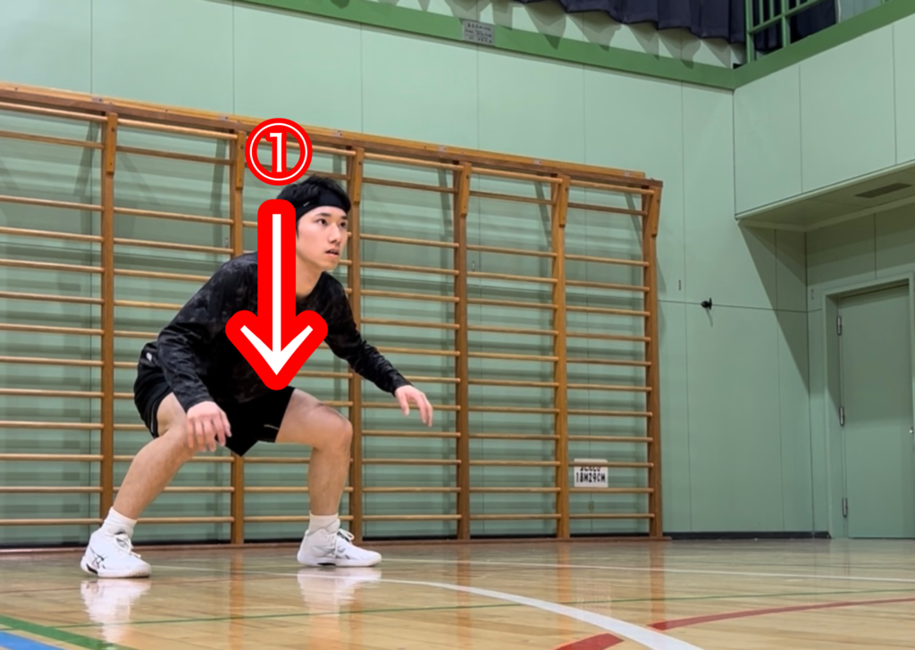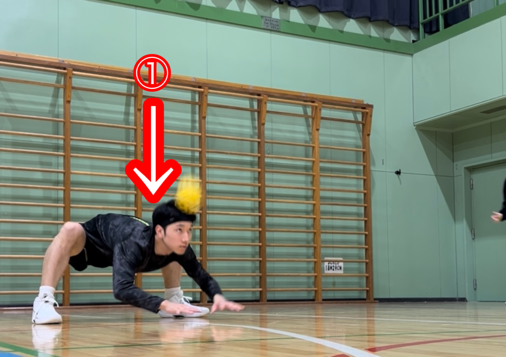 ①レシーブ位置まで頭を真下に下げる